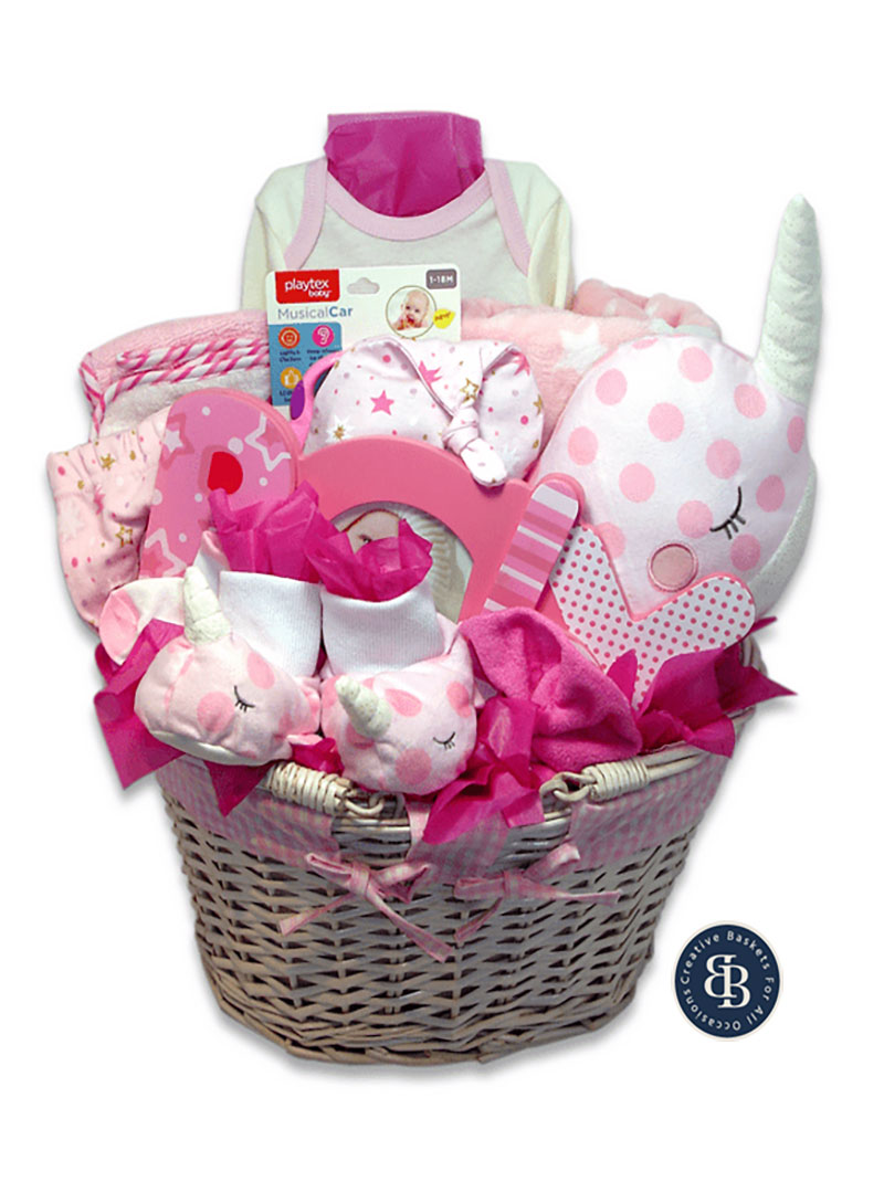 An extra special gift for the new little girl featuring an oh so cute “Love You to the Moon” diaper shirt, matching pants and knotted hat, baby socks, plush star blanket, embroidered hooded towel, an interactive musical car toy, baby washcloth, keepsake pink “Baby” frame, adorable narwhal plush booties, and a large cuddly narwhal plush all in a lined reusable basket with side handles that is perfect for the nursery!