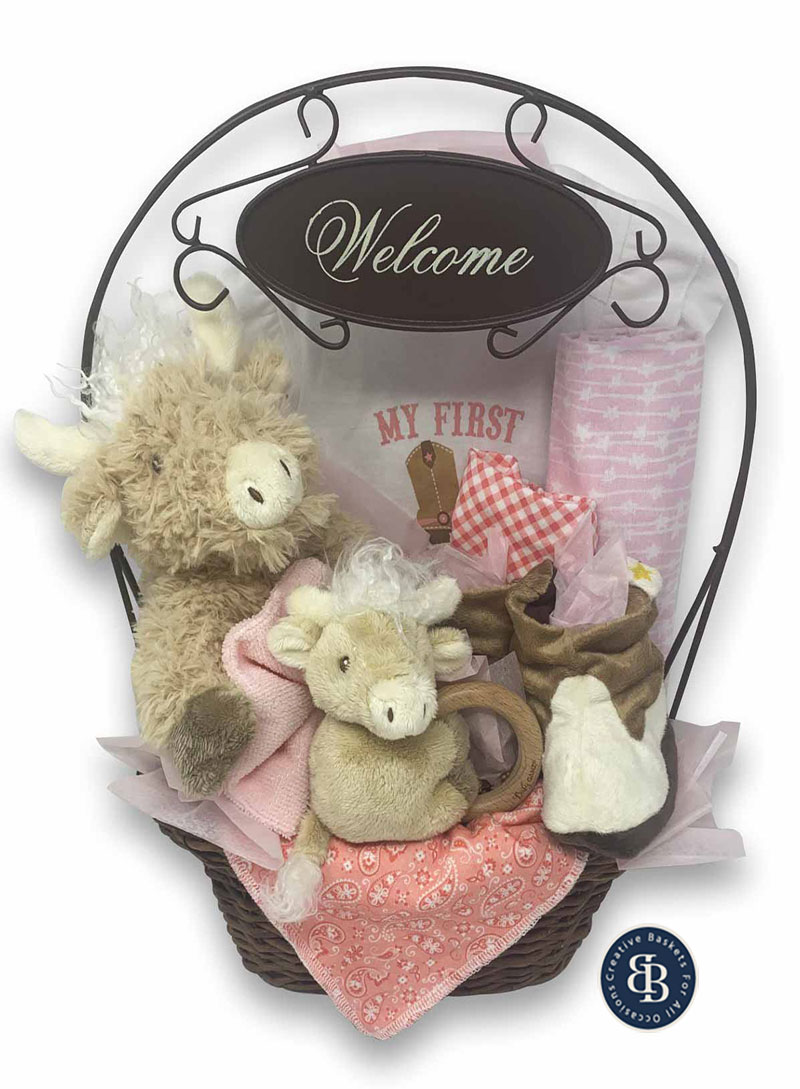 Yahoo! Welcome baby’s arrival with this special “Stampede” inspired gift featuring a “My First Rodeo” diaper shirt, plush cowboy boots, two handkerchief bibs, a receiving blanket, baby washcloth, an adorable plush Highland cow and matching plush rattle, all nestled into a reusable “Welcome” lined planter that can be used in the garden for the proud parents to enjoy.
