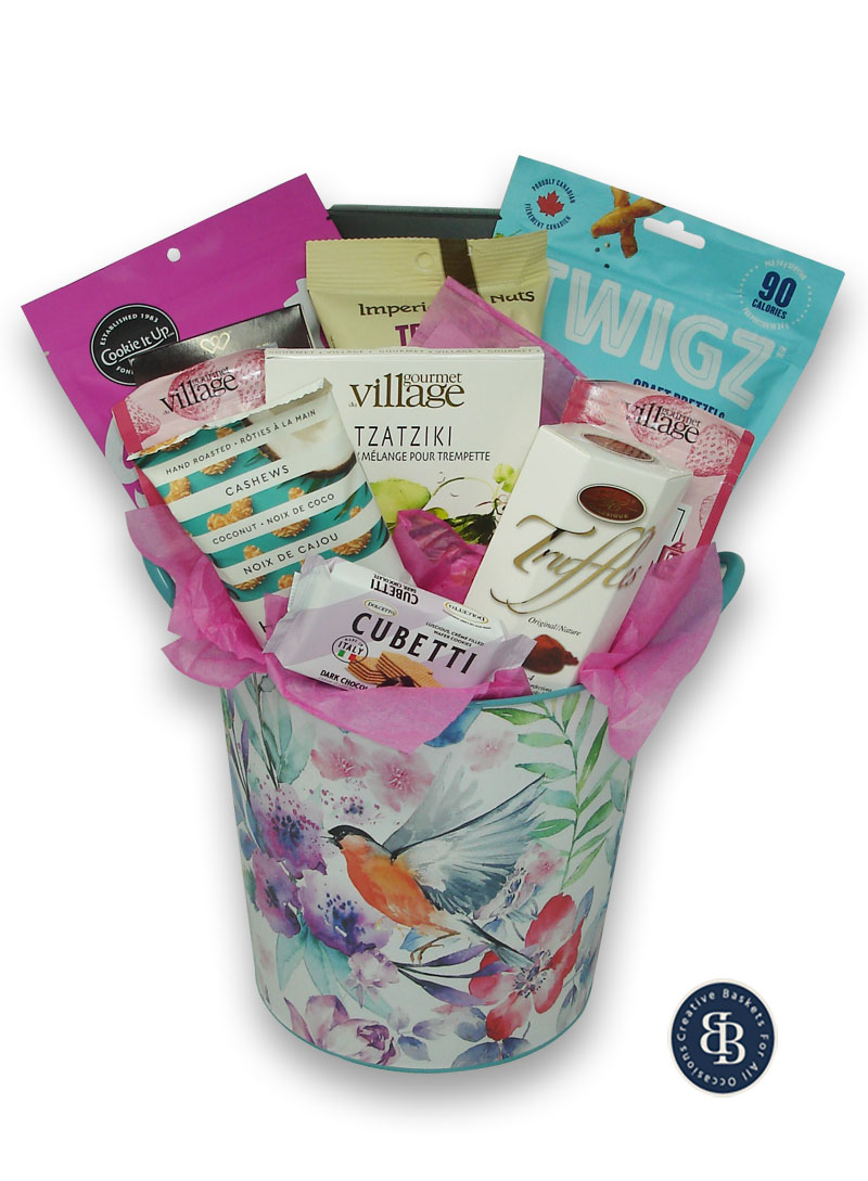 Spend a little time outdoors in the backyard with this fun selection of treats including Dolcetto Tuscan rosemary crisps, locally made Twigz original pretzels, Canadian made delectable Cookie It Up white chocolate and cranberry shortbread cookies, Imperial tropical fruit and nut mix, two Gourmet Village strawberry frose drink mixes, double chocolate meltaways, classic Belgian truffles, Canadian made Handfuel coconut toasted cashews, Cubetti dark chocolate wafers, and Gourmet Village tzatziki dip mix and recipe card, all in a reusable metal planter.