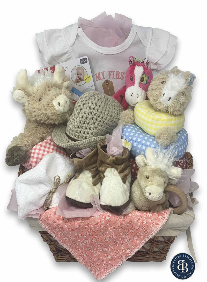 Welcome the new little cowgirl to the world with a touch of farmyard charm! Our Barnyard Friends baby gift is a delightful collection of cuddly companions and practical baby essentials, all inspired by life on the farm. Nestled inside the reusable, lined, rustic style basket is a “My First Rodeo” ruffled diaper shirt, plush cowboy boots, two handkerchief bibs, a knit baby cowboy hat, baby washcloth, an adorable plush Highland cow and matching plush rattle, stacking plush horse toy, a plush pink horse blankie snuggler, and a Playtex “Barnyard Buddies” teething fabric book with crinkle pages and teething ring. A very unique and special gift perfect for baby showers, newborn celebrations, or a welcome to Calgary gift!