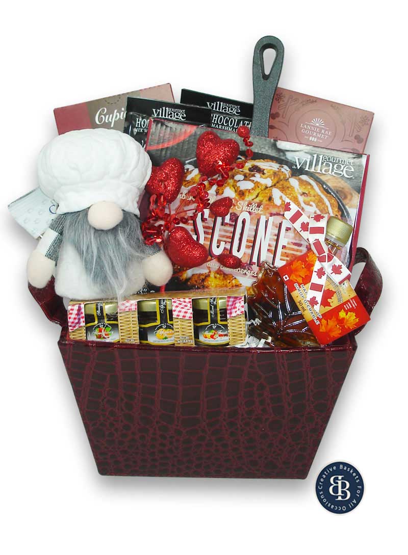 Enjoy a romantic date with breakfast for two this Valentine’s Day with delicious treats including your choice of locally made Lannie Rae gourmet pancake mix, classic Canadian maple syrup, Perfect Potful coffee, Cupido chocolate cappuccino cups, two Gourmet Village Smores hot chocolate mixes, and your choice of a Gourmet Village Cast Iron skillet kit, a trio of jams, and a keepsake gnome plush, all in moc croc container with handles. Just add the mimosas!