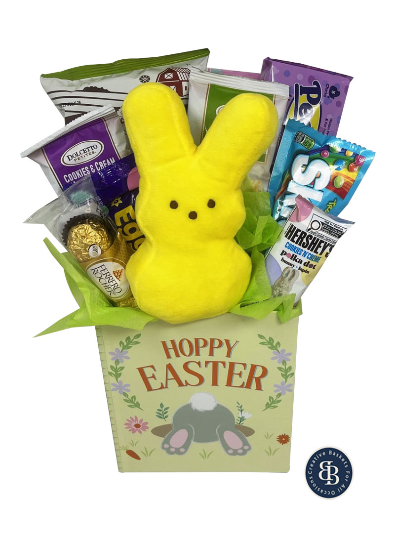 Our cottontail collection gift box is filled with Farm to Table Canadian dill pickle popcorn, classic Peeps marshmallows, Dolcetto lemon wafer bites, Dolcetto cookies and cream wafer bites, Ferrero Rocher chocolates, Skittles candy, Hershey cookies and cream chocolate bunny, Cadbury Mini Eggs, a double crisp chocolate bunny, and your choice of a Peeps bunny plush. Perfect for the older kids, or kids at heart!