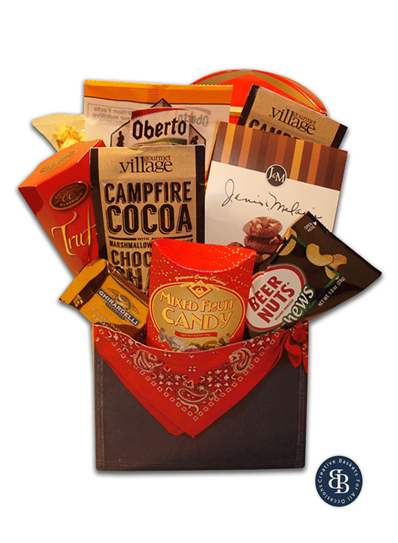 Lasso up some gourmet treats with our Western inspired gift. Chow includes caramel popcorn, beef jerky, savory butter pretzels, two campfire cocoa hot chocolate mixes with marshmallows, classic truffles, triple chocolate cookies, mixed fruit candy, beer nut cashews, and a Ghirardelli chocolate caramel square. A great choice for the Stampede or to welcome new visitors to Calgary. Giddy up!