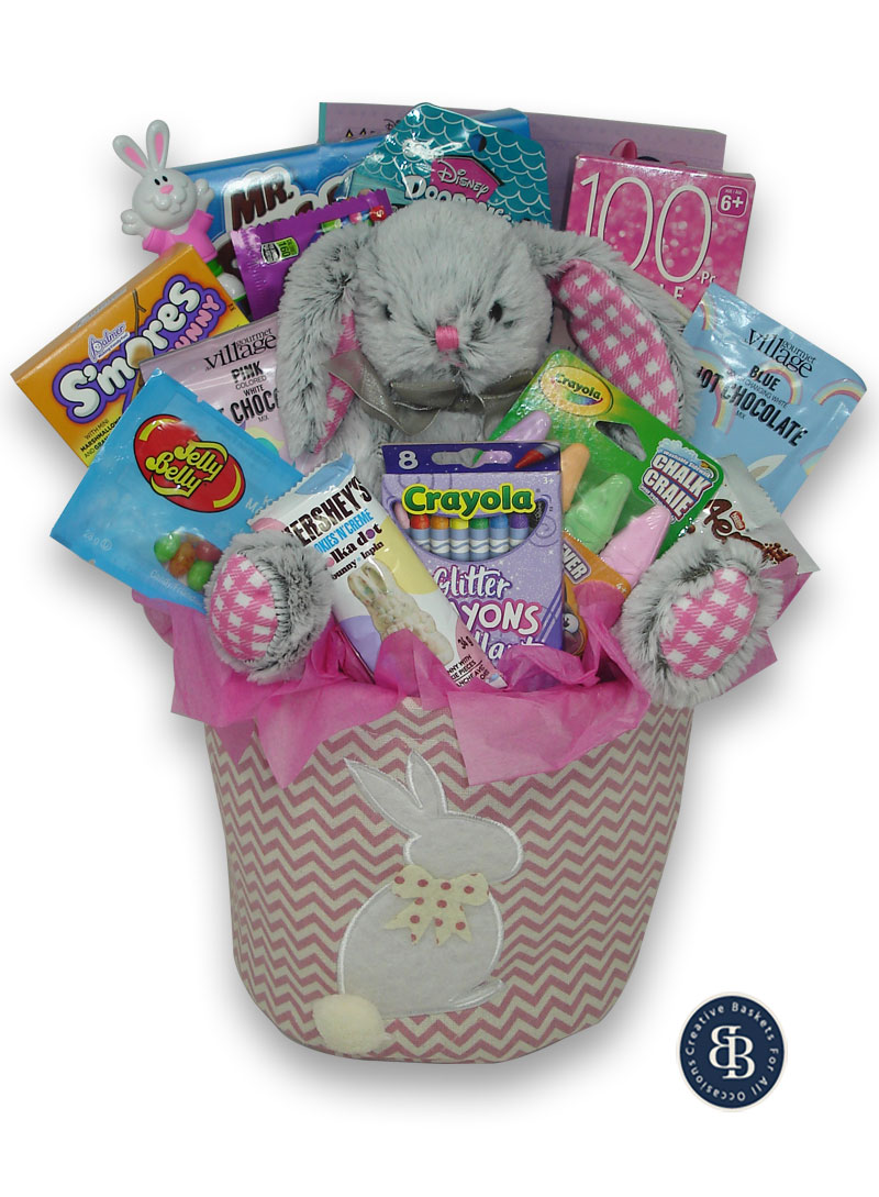Put some Spring in their step with this fun Easter selection! Surprises include a solid milk chocolate bunny, Smores milk chocolate bunny, Skittles candy, Gourmet Village Llama blue color change hot chocolate mix (just add milk), Gourmet Village Unicorn pink color change hot chocolate mix, Aero chocolate lamb, Disney Doorables mystery bag, 100pc puzzle (themes may vary), coloring book, Hershey cookies and cream chocolate bunny, Crayola chalk, Crayola glitter crayons, Jelly Belly jelly beans, bunny bubble wand, and a cuddly bunny plush all in a fabric bunny basket.