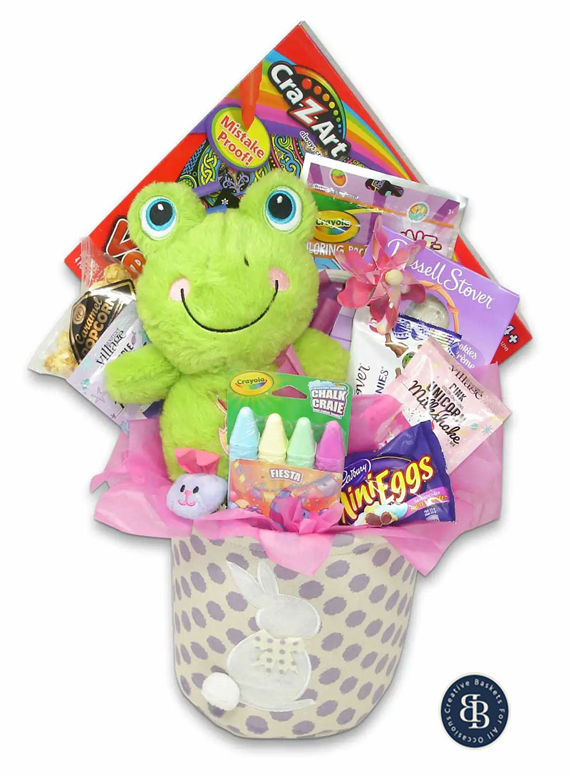 Send her a sweet Easter surprise with this fun gift featuring a velvet poster art coloring kit, a Crayola uni-creatures play pack grab and go activity pack with coloring sheets and stickers, caramel popcorn, windmill pick, cookies n’ cream chocolate bunny, Aero chocolate lamb, Gourmet Village Seahorse purple color change milkshake mix (just add milk and ice cream), Gourmet Village Unicorn pink color change milkshake mix, Crayola chalk, Cadbury Mini Eggs, and an adorable frog plush all in a fabric bunny basket.