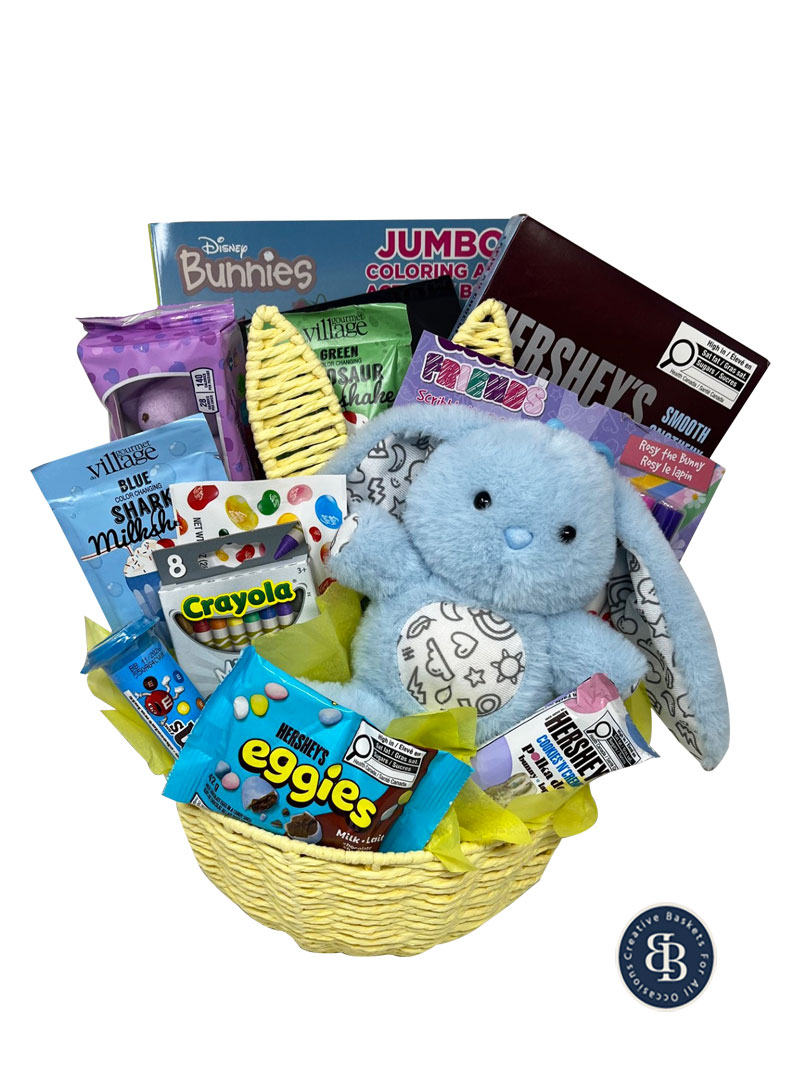 This Easter send them some egg-streme fun with this sweet selection including a milk chocolate solid Hershey bunny, classic Peeps marshmallows, chocolate chip cookies, Jelly Belly jelly beans, Eggies, Hershey cookies and cream chocolate bunny, tube of chocolate M&M’s, Gourmet Village dinosaur green color change milkshake mix (just add milk and ice cream), blue shark milkshake mix, coloring book, Crayola crayons, and a color your own plush bunny in pink or blue. Perfect for kids 5+.