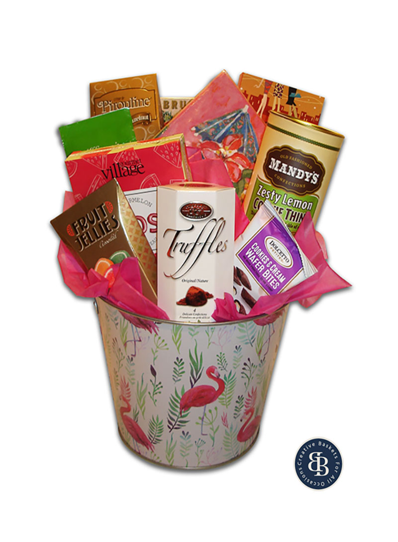 Call up the girls it’s time to Flamingle! Our flamingo inspired metal bucket includes savory bruschetta crisps, pirouline wafer rolls, Girls Night Out hot dip mix trio including artichoke and parmesan, creamy garlic, and spinach, key lime lemonade mix, summer napkins, Mandy’s zesty lemon cookie thins, pizazz jellied fruit slices, classic Belgian truffles, Dolcetto cookies and cream wafer bites, and a watermelon frosè mix that just needs ice and a bottle of rosè wine. Perfect for the patio, also makes a great thinking of you or birthday gift!