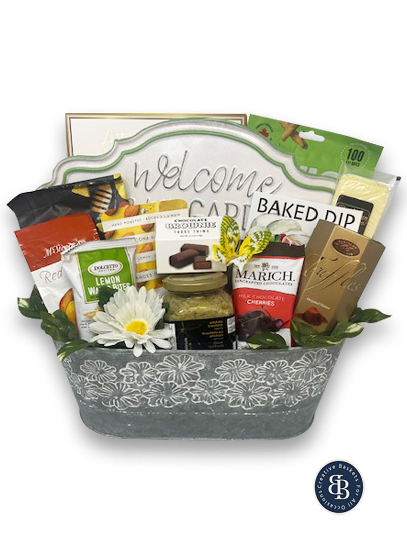Perfect for green thumbs and food lovers alike, this thoughtfully curated basket includes a charming “Welcome to my Garden” metal sign to add personality to any outdoor space, along with a selection of handpicked gourmet treats to enjoy after a day in the sun. Goodies include artisan rustic rosemary crackers, locally made dill pickle Twigz pretzels, Handfuel lemon marcona almonds, pineapple habanero honey rice chips, red peach lemonade mix, Dolcetto lemon wafer bites, fudge brownie thins, artichoke bruschetta spread, white cheddar, Canadian made Gourmet Village caprese tomato baked dip mix, Marich milk chocolate enrobed cherries, and classic Belgian truffles. Nestled in a metal floral planter, it’s a delightful gift for Mother’s Day, birthdays, housewarmings, or just because.