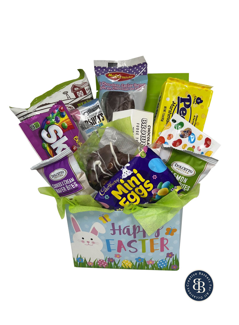 Wish them a Happy Easter with some sweet treats! Goodies include Canadian made Farm to Table dill pickle popcorn, Cookie It Up decadent chocolate chip shortbread cookies, classic Peeps marshmallows, solid milk chocolate bunny, Jelly Belly jelly beans, Hershey cookies and cream chocolate bunny, Skittles candy, Snacktales brownie thins, Dolcetto cookies and cream wafer bites, Dolcetto lemon wafer bites, Cadbury Mini Eggs, and a milk chocolate smores patty, all tucked into a fun Easter box. They will be hopping with delight!
