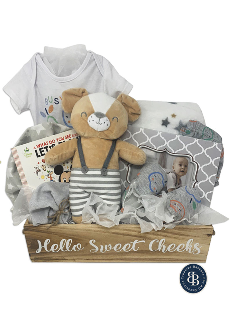 Celebrate the arrival of a sweet new baby boy with our charming Hello Sweet Cheeks gift basket — a beautifully curated collection of cozy comforts and keepsakes, made to delight both baby and parents. Nestled inside the wooden decor box (perfect for use in the nursery or as bathroom decor) is a cute diaper shirt with matching pants and shoes, beautiful soft and cuddly star plush blanket, receiving blanket, cuddly plush puppy, Disney Baby “What Do You See?” hardcover book, baby washcloth, and a keepsake “I Love You Baby” photo frame.