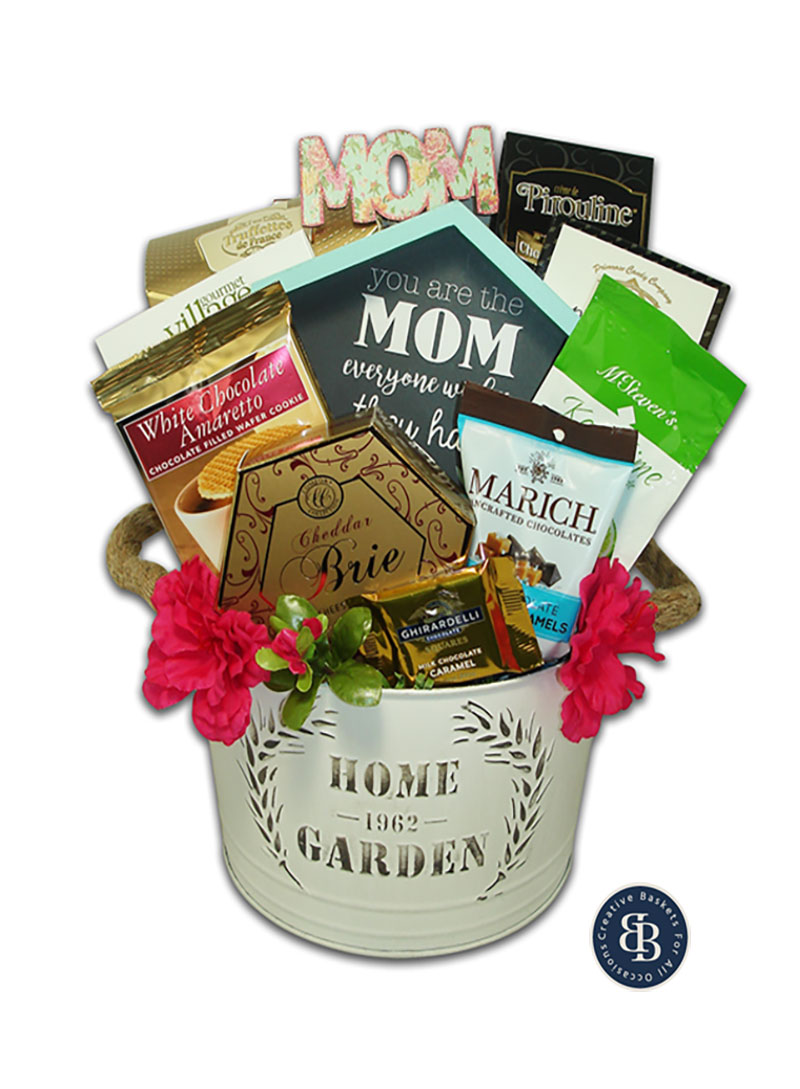 Show her how much you care with this lovely gift. Treats to enjoy while out in the garden include savory focaccia crisps, classic Belgian truffles, hazelnut pirouline wafer rolls, keylime lemonade mix, Gourmet Village roasted pepper dip and recipe card, white chocolate amaretto wafer cookie, cheddar brie cheese, mixed fruit candy, Marich dark chocolate sea salt caramels, Ghirardelli milk chocolate caramel square, and a Mom floral garden pick, all in a metal planter with rope handles perfect for plants when all the goodies are gone. For the home we have included a keepsake décor sign just for Mom in your choice of saying, “Home Is Where Your Mom Is” or “You Are The Mom Everyone Wishes They Had”. Brighten her day and show her the love!