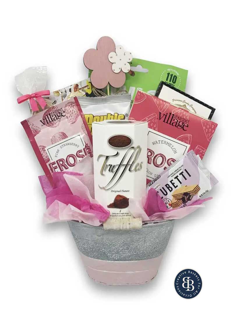 Spring is in bloom with this selection of cheerful treats! Our butterfly inspired oval metal planter is filled to the brim with locally made zesty pickle Twigz pretzels, Funky Chunky chip-zel-pop (a delicious combination of chips, popcorn and pretzels drizzled in chocolate and caramel), mixed fruit candy, Cubetti dark chocolate wafers, classic Belgian truffles, Watermelon Frose drink mix (a delicious wine slushy drink just add Rosé wine, ice and blend), Strawberry Frose mix, Double Dutch caramel wafer cookie, milk chocolate spring flowers, and a pretty wooden flower pick to compliment the planter. A perfect gift to brighten someone’s day, say thank you, or let them know you are thinking of them!