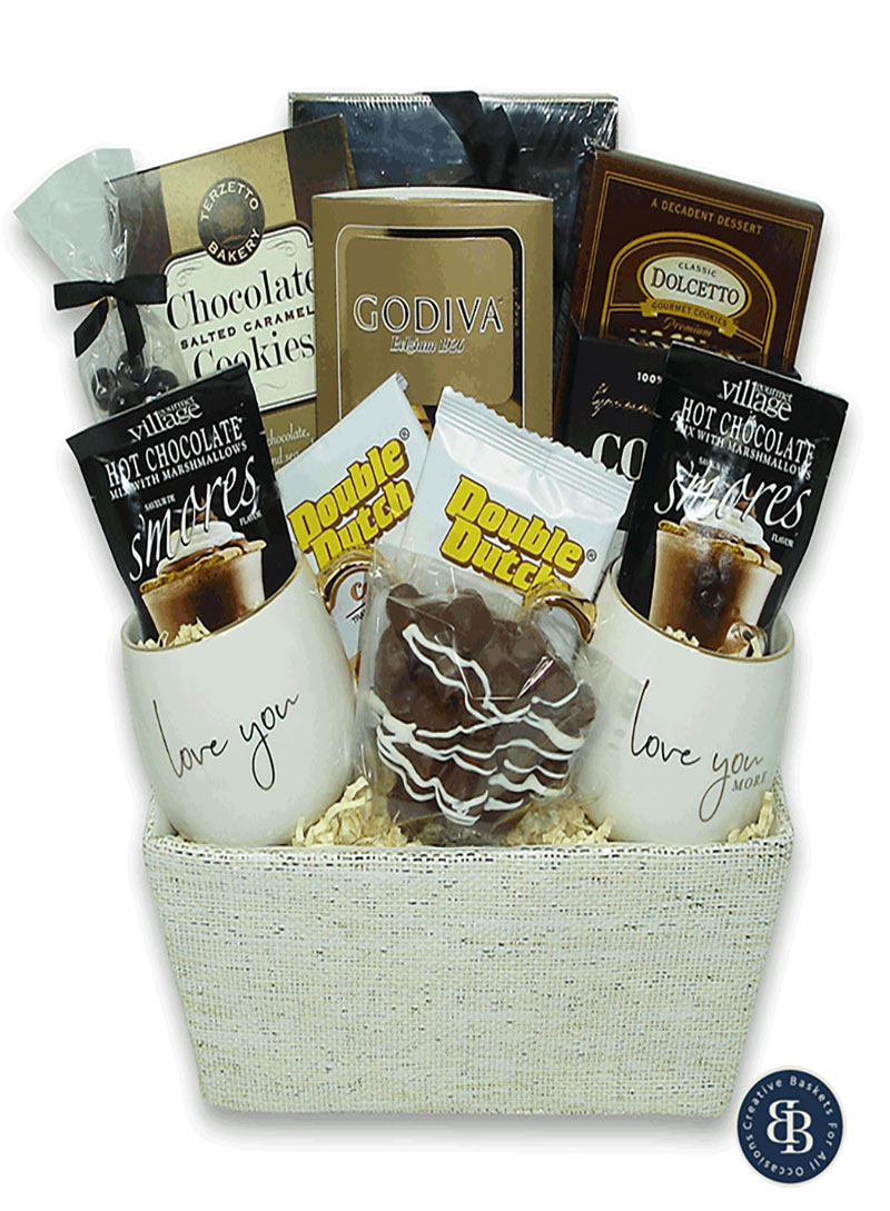 Show them you love them more than chocolate with this sweet selection of treats! Contents include a box of decadent milk chocolate pecan caramel clusters, chocolate salted caramel cookies, dark chocolate espresso beans, Dolcetto chocolate wafer rolls, two smore’s gourmet hot chocolate mixes, Godiva chocolate truffle specialty coffee, two Double Dutch traditional caramel waffle cookies, Colombian coffee, a delicious milk chocolate smore’s patty, and two ceramic mugs “Love You” and “Love You More”, all in a gorgeous reusable container. Perfect for sharing love any time of year, makes a great wedding or anniversary gift too!