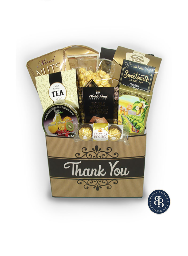 Show your gratitude for a job well done with this gift of gourmet treats. Goods include butter pretzels, classic mixed nuts, caramel popcorn, gourmet chocolate chip cookies, locally made Sweetsmith English Toffee peanut brittle, English breakfast tea, classic Belgian truffles, smoked almonds, World’s Finest double chocolate meltaways, Ferrero Rocher chocolates, and mixed fruit candies. Great for sharing too!