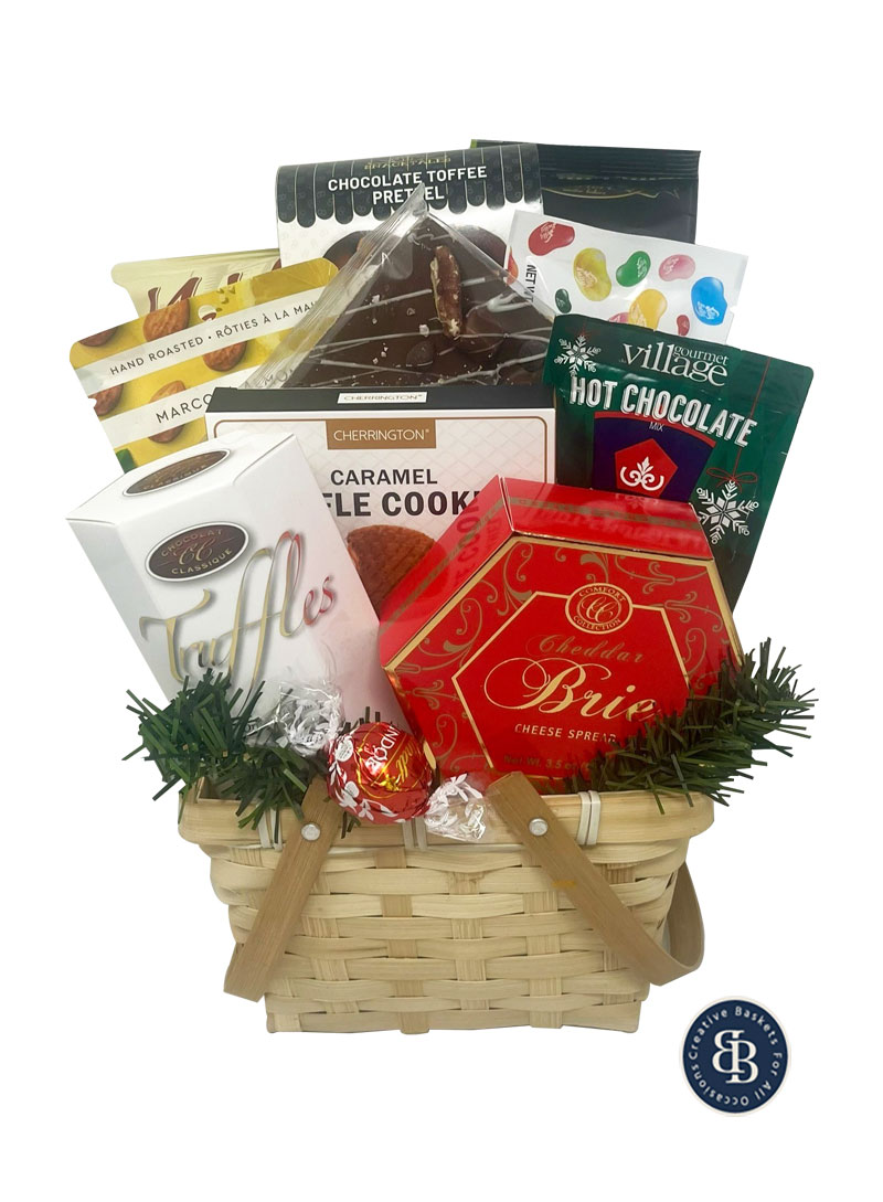 Let the snacking begin with Merry Munchies, a fun and flavorful assortment bursting with holiday spirit. Filled with Scrocchi rosemary crackers, cheddar brie cheese, Miss Vickie’s original chips, Handfuel marcona almonds, classic truffles, chocolate toffee pretzel, Jelly Belly jelly beans, Cherrington waffle cookies, double truffle gourmet hot chocolate mix, Lindor chocolate, and a decadent Heavenly Hash milk Chocolate bark with marshmallows, pecans, and chocolate chips. Perfect for sharing—or savoring solo—it’s a cheerful way to add a little extra joy to the season.