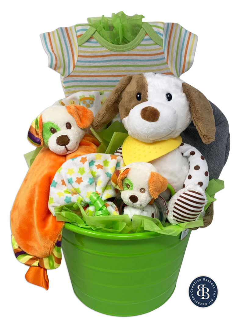 Baby’s first puppy includes a cuddly plush activity puppy pal that rattles, has crinkle ears, and teething elements, soft puppy blankie snuggler, matching soft plush puppy ring rattle, a diaper shirt, receiving blanket, “Little Man” baby hat, and washcloth, all in a reusable tin. Perfect for little boys!