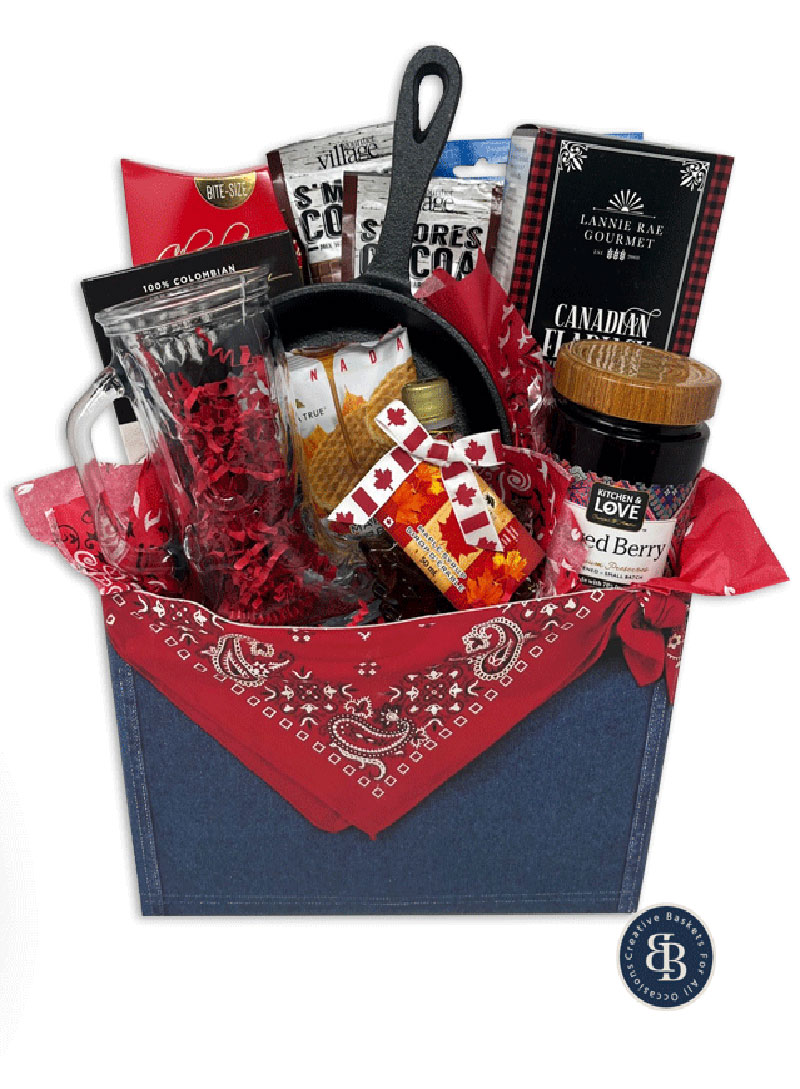 Enjoy a delicious home made pancake breakfast without the Stampede line ups! Our cowboy inspired gift box is filled to the brim with locally made Lannie Rae Gourmet pancake mix in your choice of flavor (Canadian Maple Flapjack shown), Cucina & Love mixed berry preserve, Colombian coffee, two Gourmet Village smores hot chocolate mixes, traditional maple candies, Canadian maple waffle cookie, chocolate chip cookies, a glass cowboy boot mug, a cast iron skillet, and an authentically Canadian favorite, Jakeman’s maple syrup in a maple leaf shaped glass. A perfect breakfast treat, or welcome to Calgary gift!
