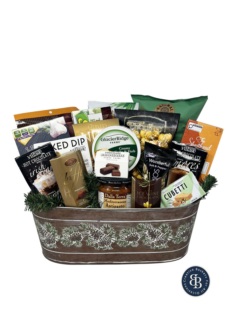 This festive basket inspired by the crisp air of the Alpines is designed to bring the cozy charm of the mountains right to your doorstep. Enjoy savoury rosemary truffle potato chips, Wisecrackers roasted garlic & rosemary crackers, milk chocolate and caramel pretzel crisps, Happy Oro chocolate coated wafers with caramel cream & caramel flakes, Bali’s Best espresso candies, caramel popcorn, The Shortbread Factory Canadian made butter toffee shortbread cookies, Gourmet Village award winning parmesan artichoke dip and recipe card, savoury mediterranean antipasto, creamy garlic and herb cheese wedges, Pirouline chocolate wafer rolls, ice wine chocolates, salt and pepper pistachios, Truly jellied fruit slices, hazelnut cubetti wafer, chocolate brownie fudge thins, gourmet mixed nuts, classic truffles, Gourmet Village smore’s hot chocolate and Irish cream hot chocolate mixes, all in a gorgeous pinecone metal container.
