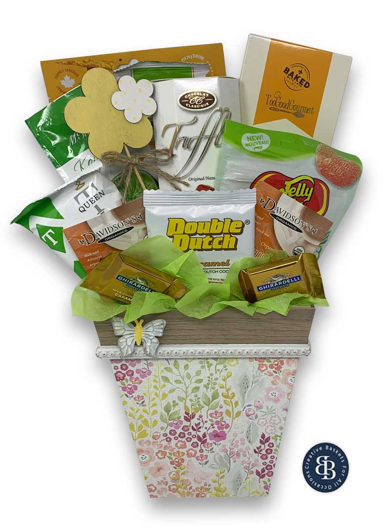 Embrace Spring with this delightful and cheerful basket perfect for any occasion! Treats include locally made addictive Twigz cheddar ranch pretzels, Too Good Gourmet salted creme brulee cookies, red peach lemonade mix, rich Belgian truffles, Handfuel lemon marcona almonds, organic orange spice tea, two Ghirardelli milk chocolate caramel squares, Jelly Belly gummy candies, Double Dutch traditional caramel wafer cookie, and a wooden flower plant pick, all in a spring inspired plant container. Makes a great thinking of you, get well, or just because gift. A perfect choice to brighten their day!