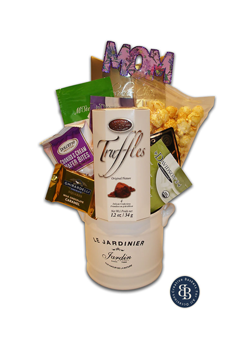 Let her know that you are thinking of her with this sweet gift! Treats include chocolate chip cookies, key lime lemonade mix, caramel popcorn, classic Belgian truffles, Dolcetto cookies and cream wafer bites, organic spiced pear tea, organic spiced raspberry tea, Ghirardelli chocolate caramel square, “Mom” floral pick (other selections available if you are gifting to a friend) and a metal watering can that holds a 4″ pot after the goodies are gone.