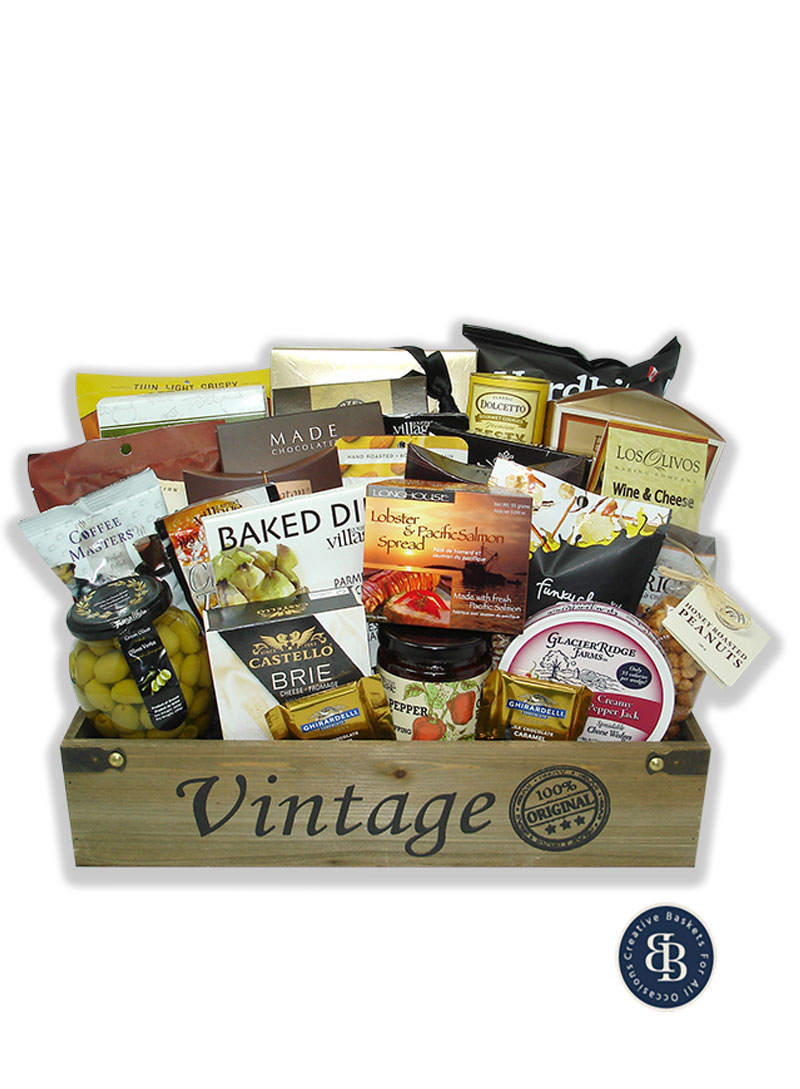 Make them feel extra VIP with this exceptional gift basket! Our vintage wooden crate is filled to the brim with delicious gourmet goods including an assortment of milk and dark Heritage chocolates, salted caramel Brownie Brittle, sea salt and pepper Hard Bite chips, Partners olive oil and herb crackers, classic tea candies, chocolate salted caramel cookies, Dolcetto zesty lemon wafer rolls, savory butter pretzels, Los Olivos wine and cheese biscuits, gourmet snack mix, Made dark chocolate truffles, Gourmet Village salted caramel hot chocolate mix, Marich English toffee caramels, Funky Chunky chip-zel-pop (addictive popcorn, pretzels and chips drizzled in caramel and chocolate), Gourmet Village parmesan artichoke dip mix and recipe card, Cherrington butterscotch drops, Hand Fuel marcona almonds and lemon, smoked salmon, French roast coffee, jar of olives, brie cheese, Gourmet Village caramel brulee hot chocolate mix, lobster and salmon pate, honey roasted peanuts, Glacier Ridge creamy pepper jack cheese, red pepper jelly, and two Ghirardelli milk chocolate caramel squares. Perfect for sharing!