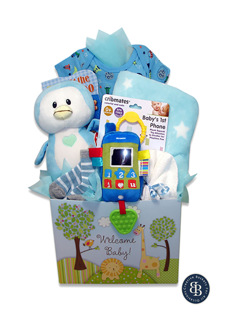 A great way to Welcome Baby! Items for the new addition feature a cuddly diaper shirt, Sesame Beginnings baby book, cozy star fleece blanket, baby washcloth, plush Ty Penguin toy, baby socks, and a plush Baby’s First Phone interactive toy with squeaker, chew tags and textured teether. Too cute!