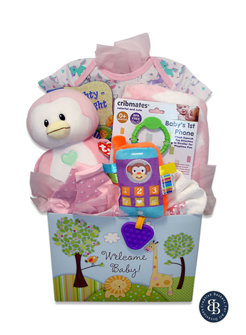 A great way to Welcome Baby! Items for the new addition feature a cuddly diaper shirt, Sesame Beginnings baby book, cozy star fleece blanket, baby washcloth, plush Ty Penguin toy, baby socks, and a plush Baby’s First Phone interactive toy with squeaker, chew tags and textured teether. Too cute!