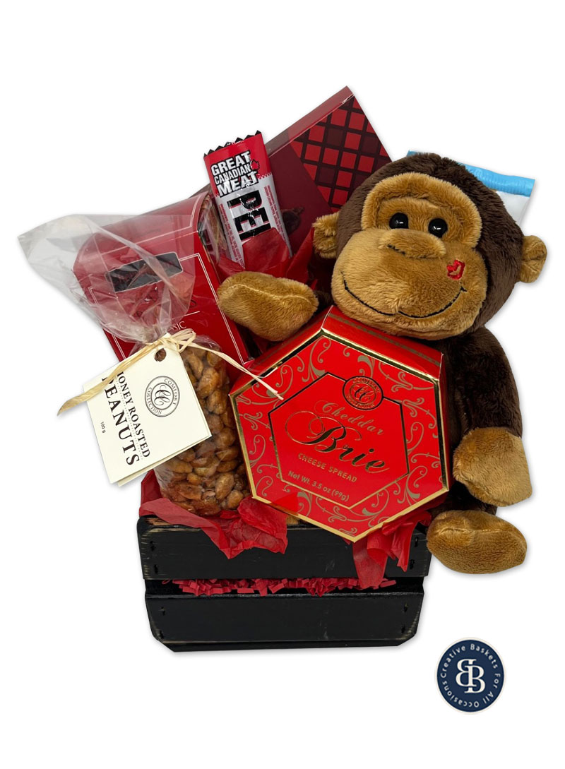 Show them how wild you are about them with this gift of sweet and savory treats. Goodies include Canadian made decadent truffles, Cherrington water crackers, honey roasted peanuts, cheddar brie cheese, Great Canadian hot pepperoni, chocolate waffle cookie, and an adorable kissing plush monkey, all in a rustic wooden crate.
