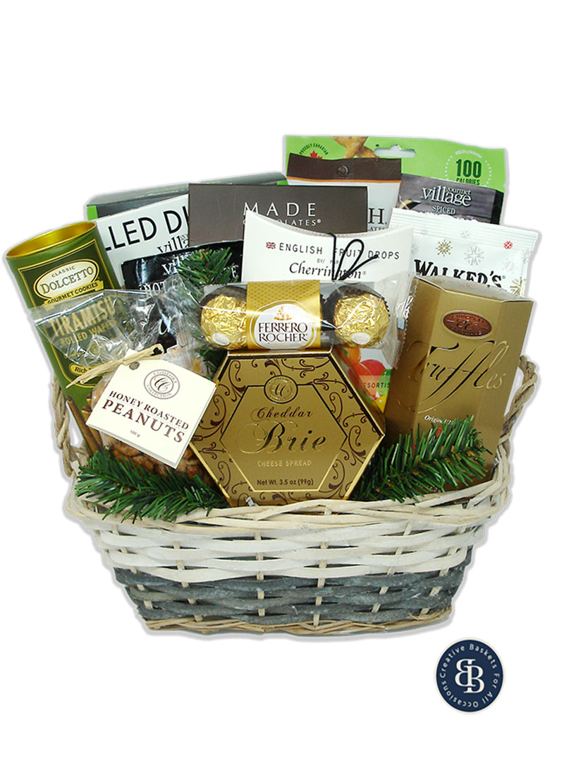 Delicious and delightful, this gift is sure to please! Contents include Scrocchi rosemary crackers, Twigz zesty dill pickle pretzels, Gourmet Village roasted garlic dip mix and recipe card, Marich milk chocolate English Toffee caramels, aromatic spiced apple cider mix, Dolcetto tiramisu wafer rolls, Gourmet Village Irish Cream hot chocolate mix, Made toffee crunch cocoa truffles, Walkers all butter festive shortbread, Cherrington English fruit drops, honey roasted peanuts, Ferrero Rocher chocolates, cheddar brie and classic Belgian truffles.